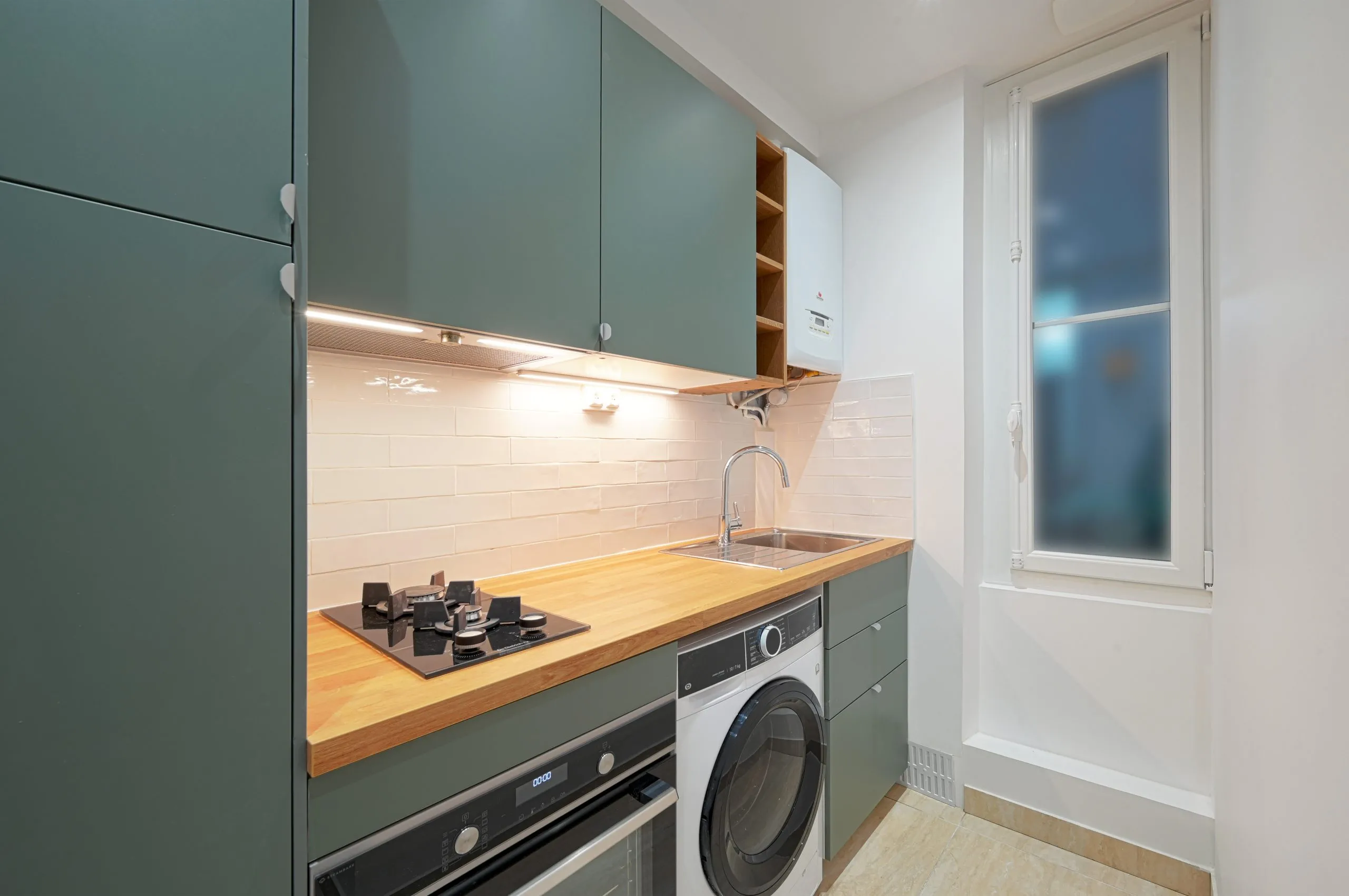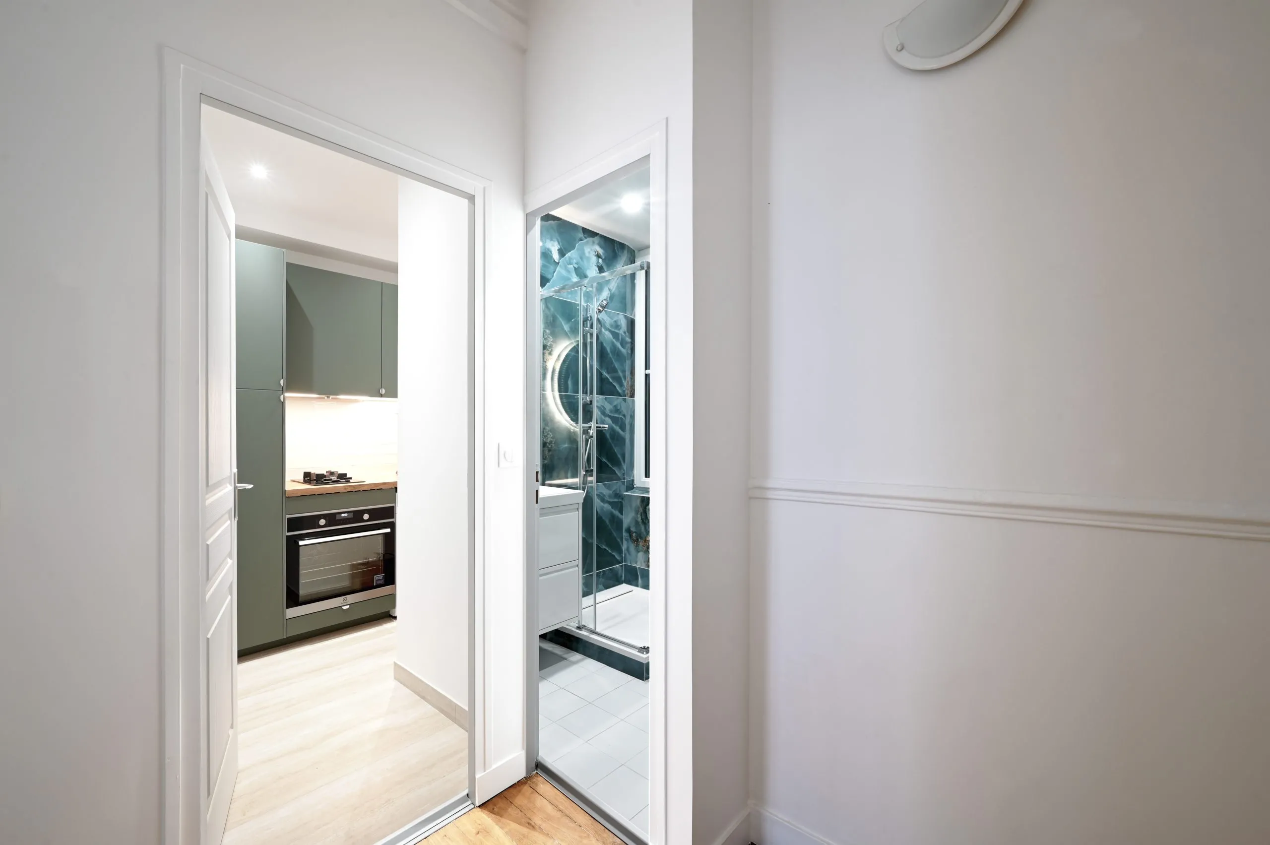 Nous avons notamment redéfini les cloisons entre la cuisine et la salle d’eau, permettant de créer deux espaces clairement distincts, mieux proportionnés et plus ergonomiques. Cette nouvelle configuration offre une fluidité accrue et maximise la surface disponible dans un appartement de petite superficie.