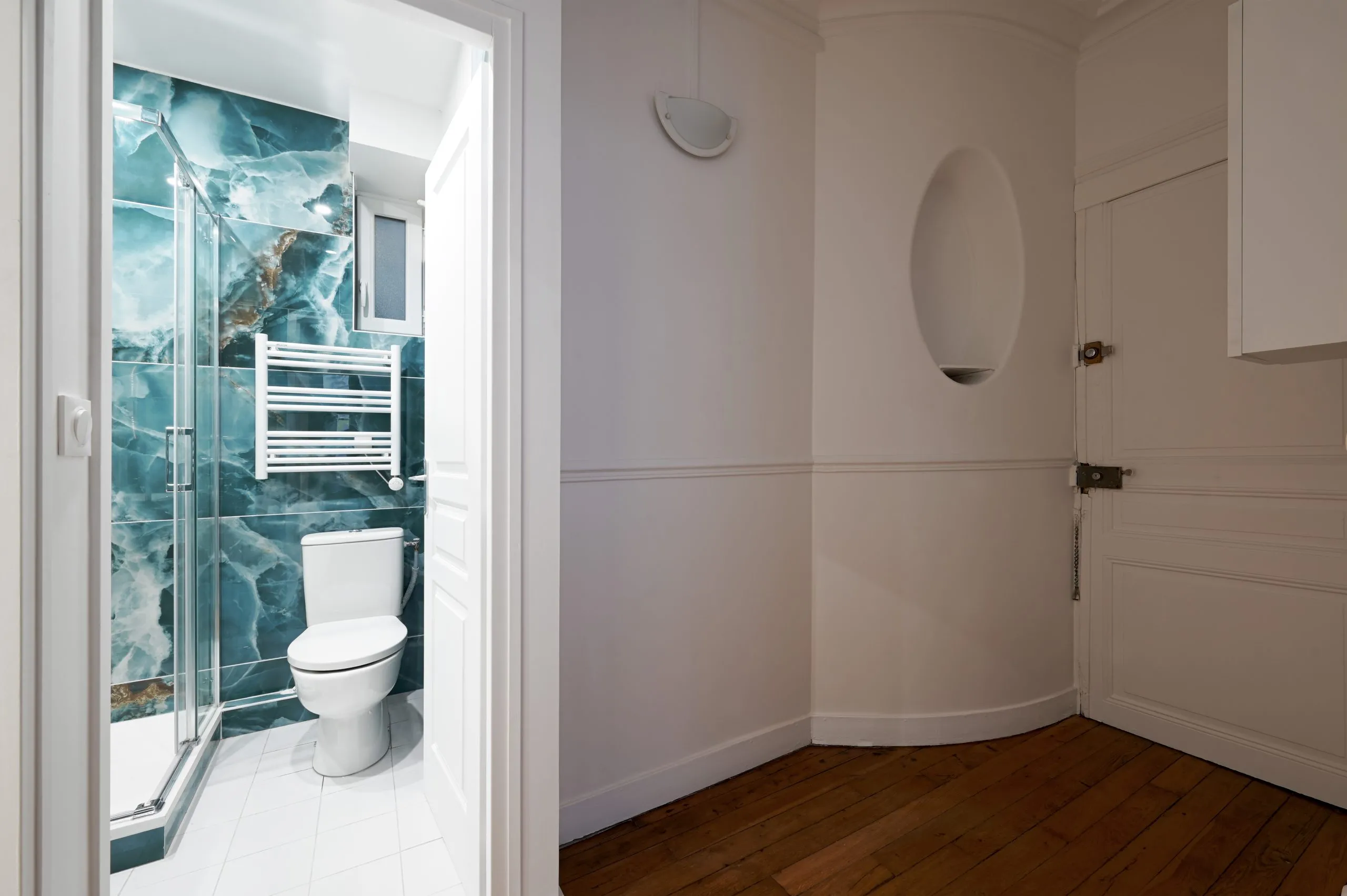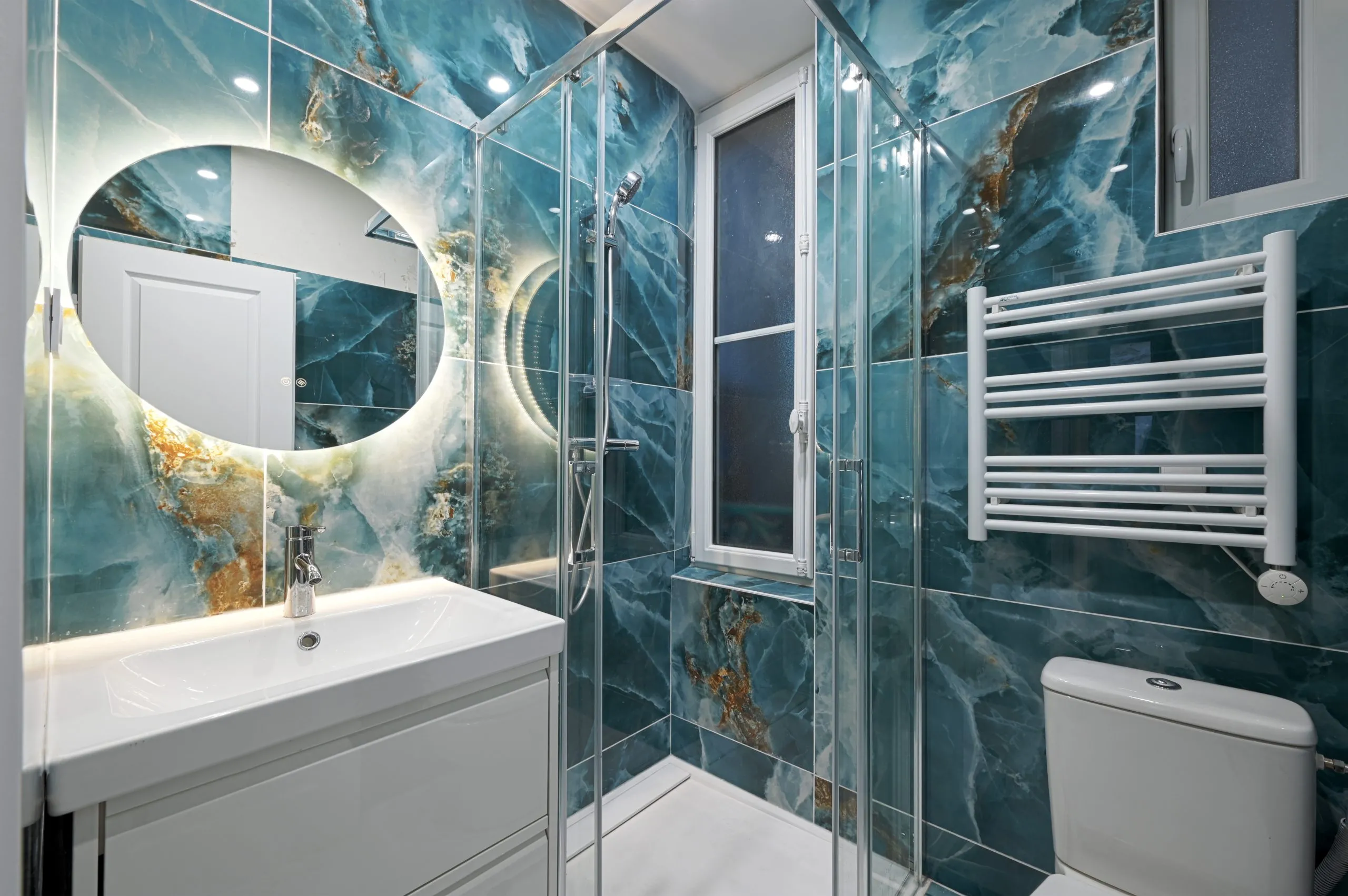La salle d’eau se distingue par des carreaux turquoise effet marbre, apportant une touche forte de caractère et un esprit contemporain. Leur texture raffinée et leurs nuances profondes créent une atmosphère élégante tout en rendant l’espace lumineux et structuré.